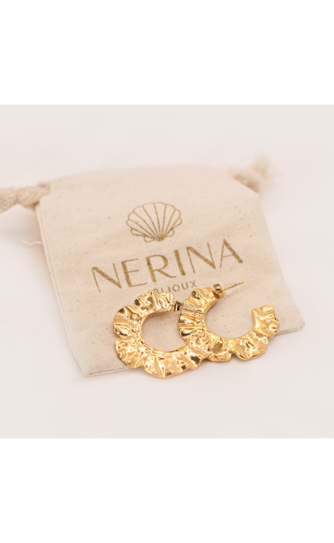 Hammered flower-shaped earrings. - Clasp: Push-back posts - Diameter: 34 mm - Quality jewelry made by a French company - Durable for everyday use: 10-year certified plating - Comes in a Nerina Bijoux organic cotton pouch Material: Stainless steel To ensure the longevity of your jewelry, please take a look at our care instructions.