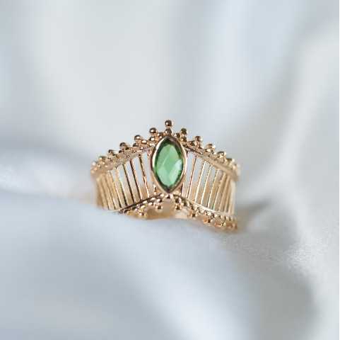 Cette bague, plaqué or 18 carats, est ajourée sertie d'une petite pierre précieuse d'améthyste verte