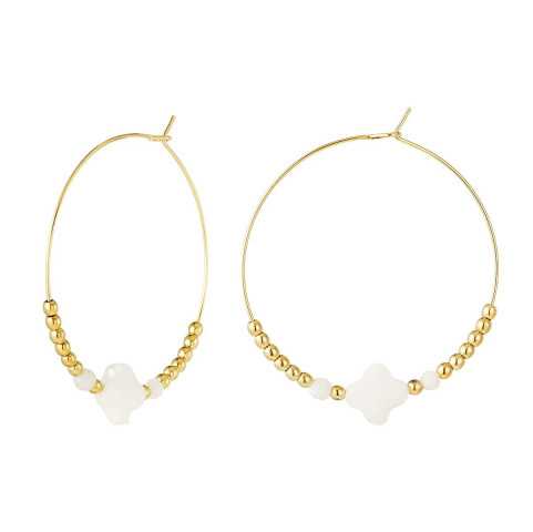 Déjese seducir por nuestros pendientes criollos con su bonito trébol de nácar y sus perlas doradas de acero inoxidable. Resistirán los envites de la vida cotidiana.
