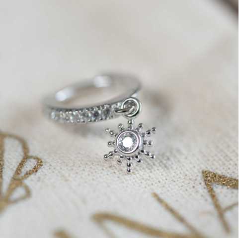 Pendientes mini aro de plata 925 rodiada con pavé de diamantes y colgante sol.