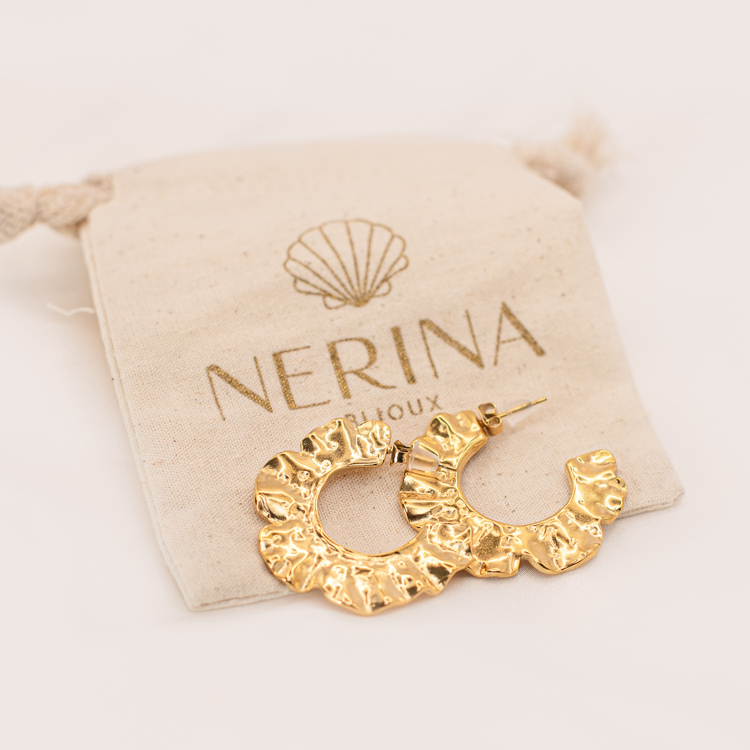 Orecchini martellati a forma di fiore. - Chiusura: aste di spinta - Diametro: 34 mm - Gioielli di qualità realizzati da un'azienda francese - Resistente quotidianamente: placcatura certificata 10 anni - Consegnato in una custodia in cotone biologico Nerina Bijoux Materiale: acciaio inossidabile Per far sì che i tuoi gioielli durino a lungo, dai un'occhiata ai nostri consigli per la cura.